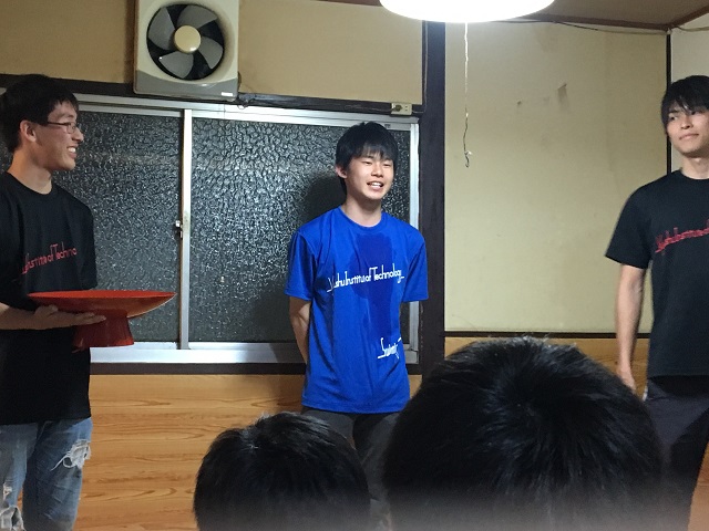 レセプションにて新入生の挨拶です。